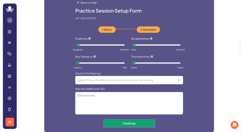 Sign up and personalize your practice by choosing donor avatars, funder categories, and specific meeting goals tailored to your fundraising needs.