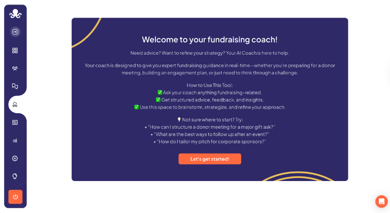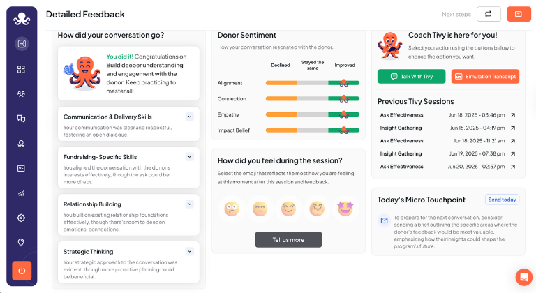 Coach Tivy is here to provide expert, real-time fundraising guidance whenever you need it. Whether you’re gearing up for a donor meeting, creating an engagement strategy, or tackling specific fundraising challenges, Tivy is ready with structured advice, empathetic feedback, and actionable insights.